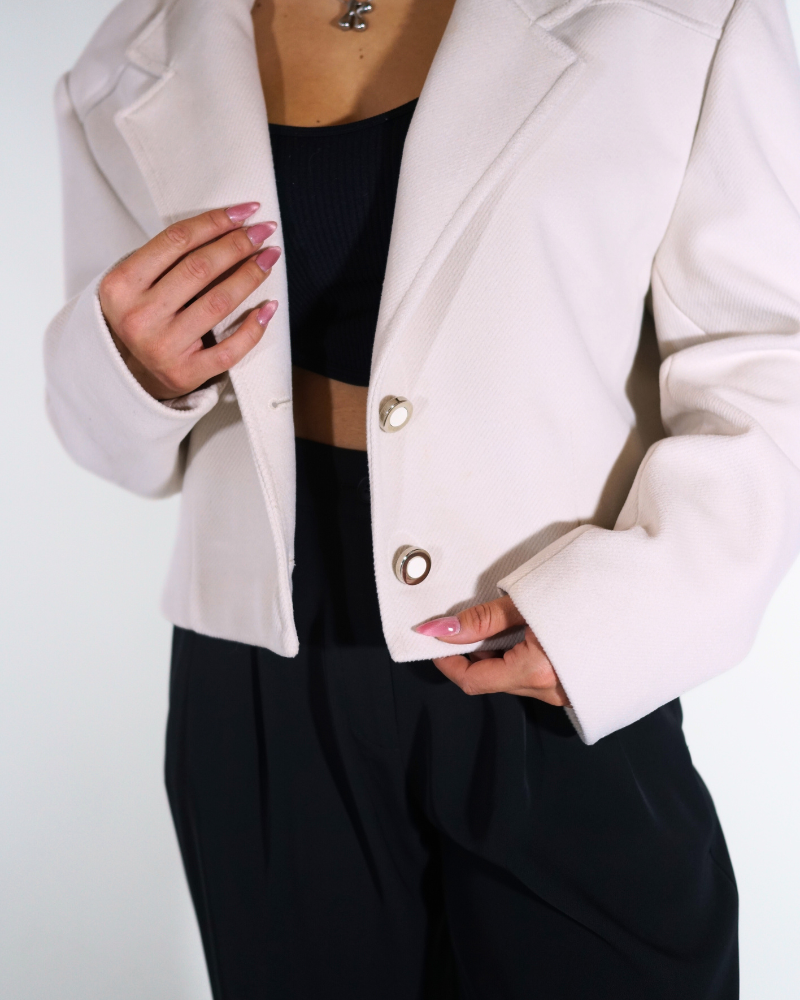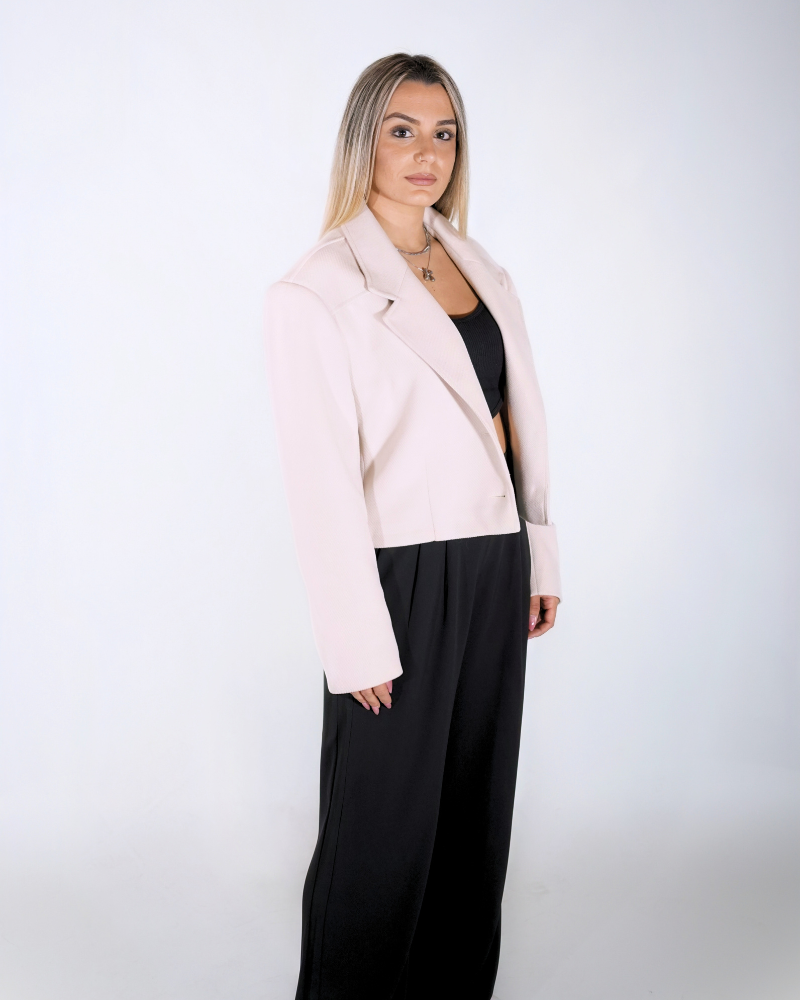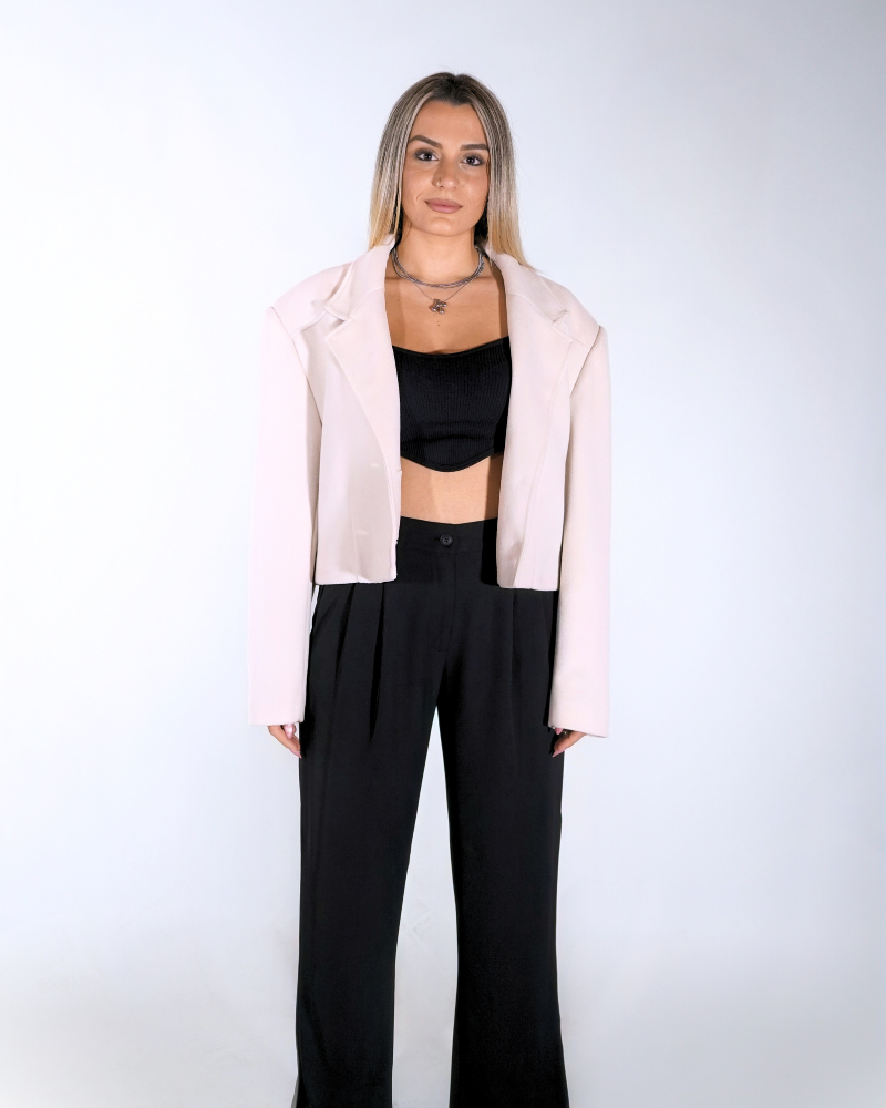 Ένα κομψό crop τζάκετ με καθαρές γραμμές και εκλεπτυσμένη, μινιμαλιστική αισθητική.