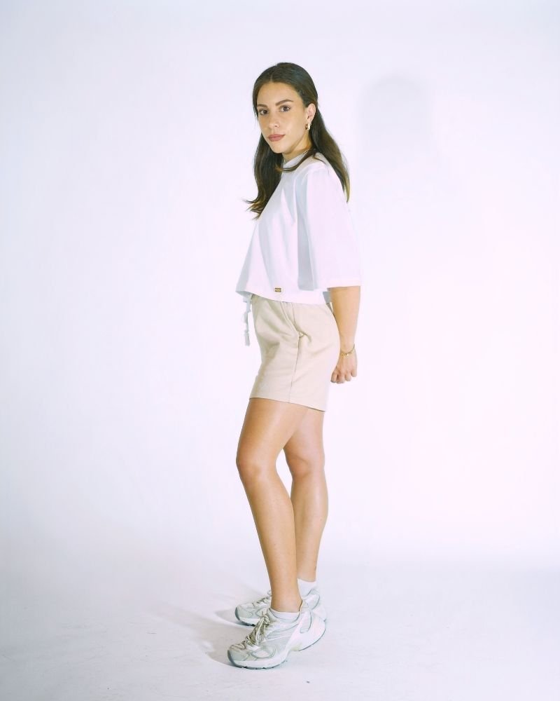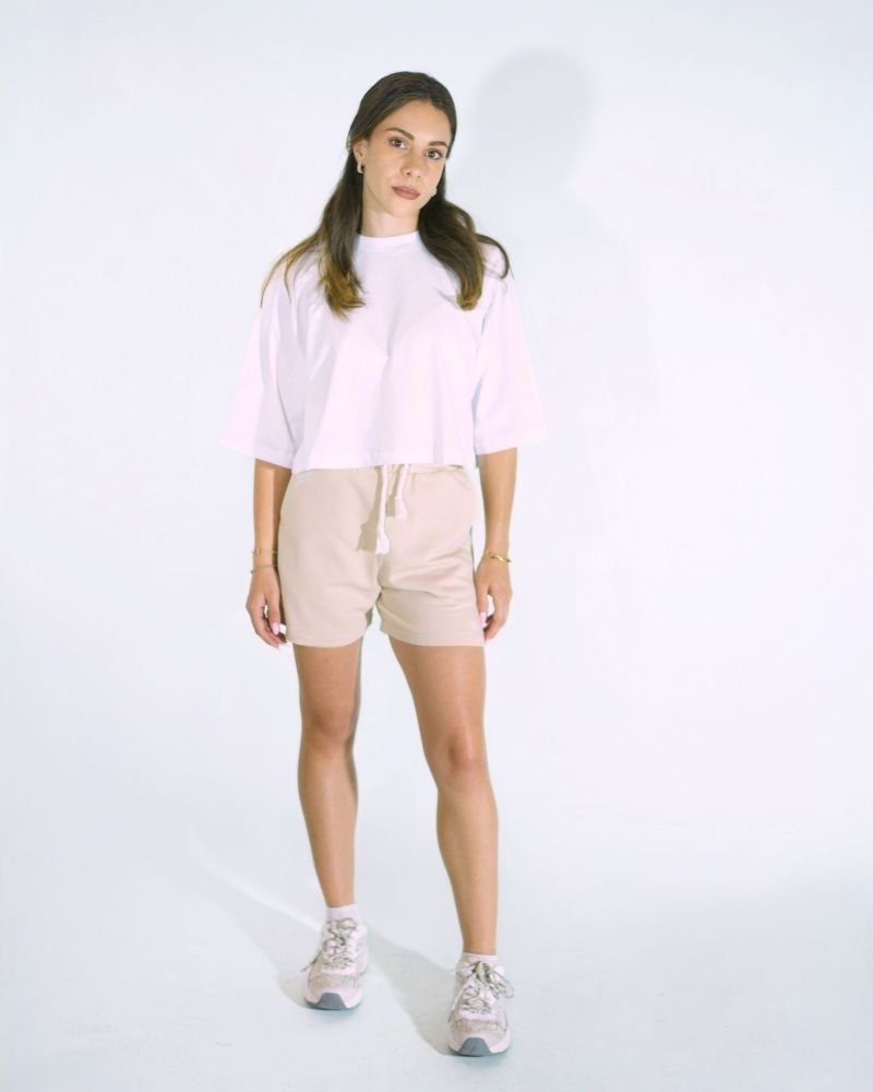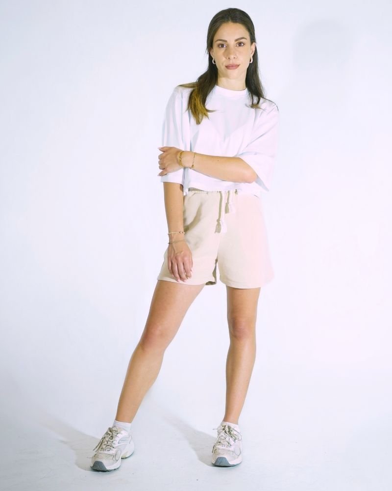 Γυναικείο μπεζ σορτς με αθλητική κομψότητα και χαλαρή εφαρμογή. Διαθέτει λάστιχο και