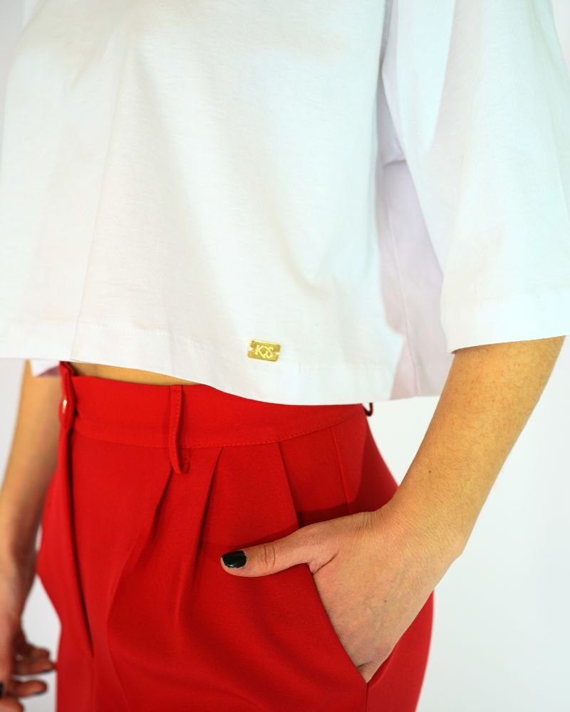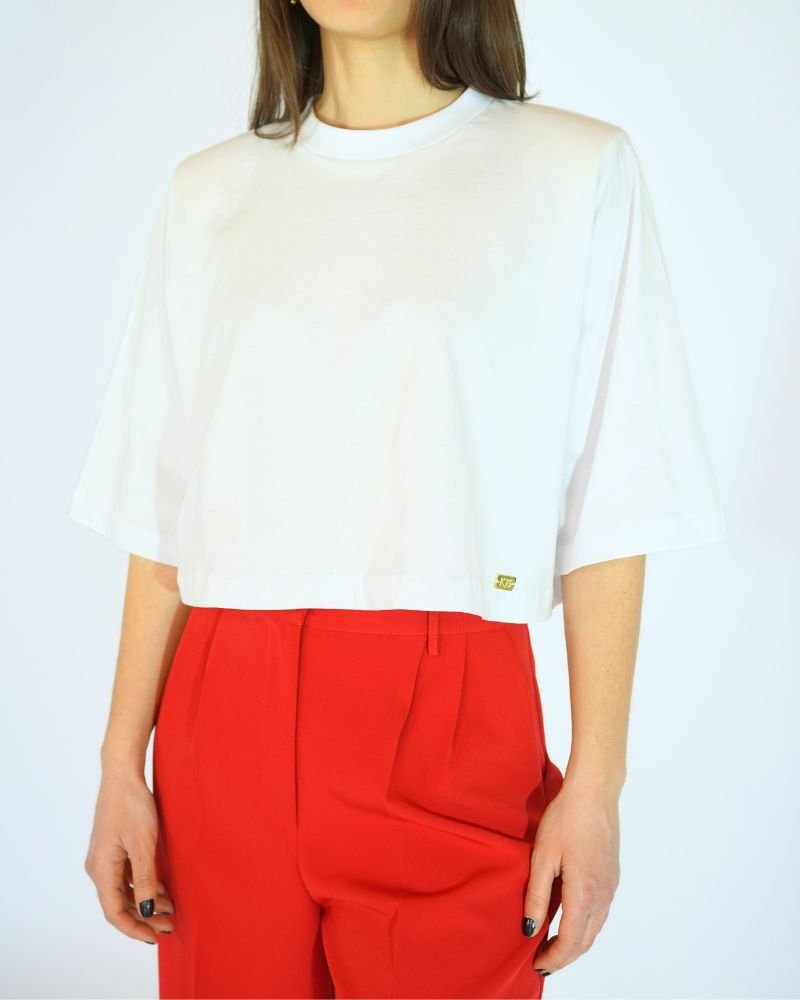 Αναδείξτε το στυλ σας με αυτό το μοντέρνο και κομψό λευκό crop κοντομάνικο μπλουζάκι.