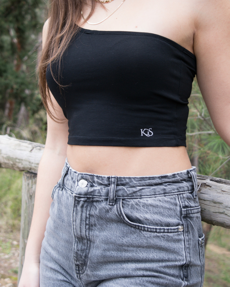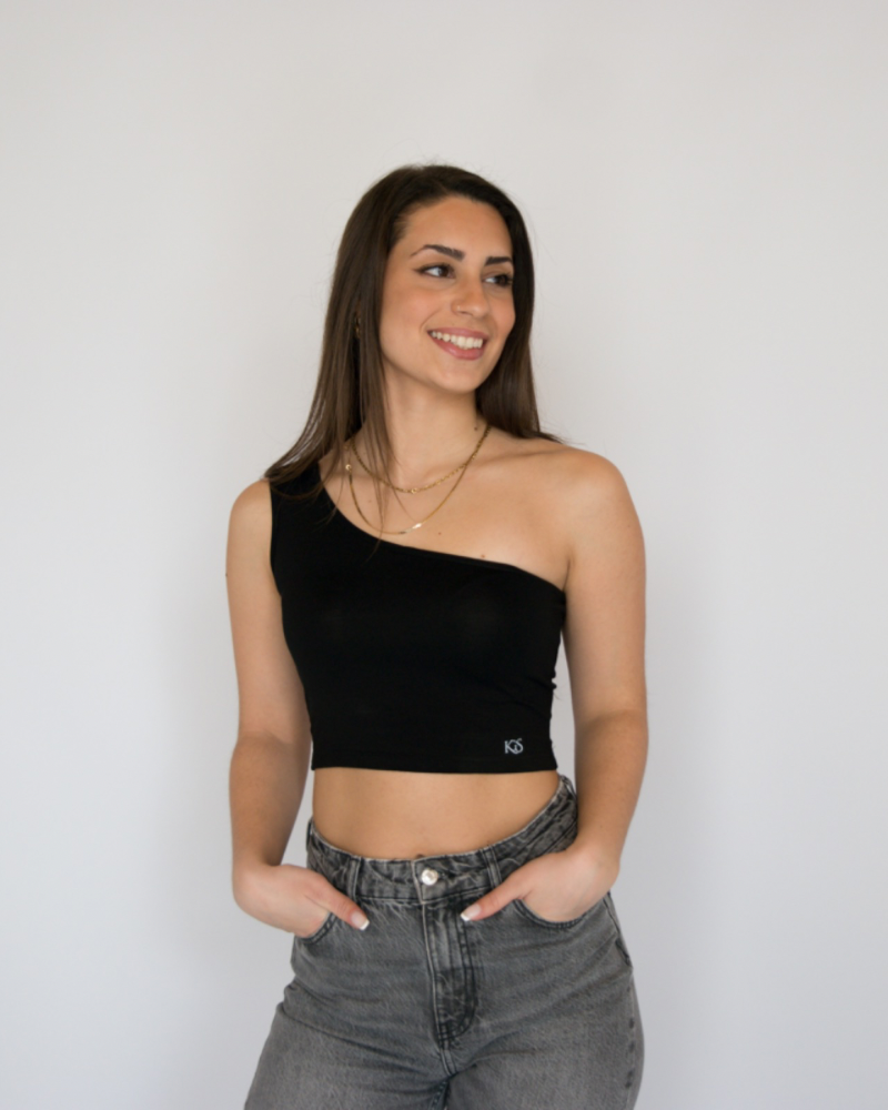 Το μαύρο top με ένα ώμο αποπνέει διαχρονική γοητεία και κομψότητα, καθιστώντας το ιδανικό για κάθε περίσταση.