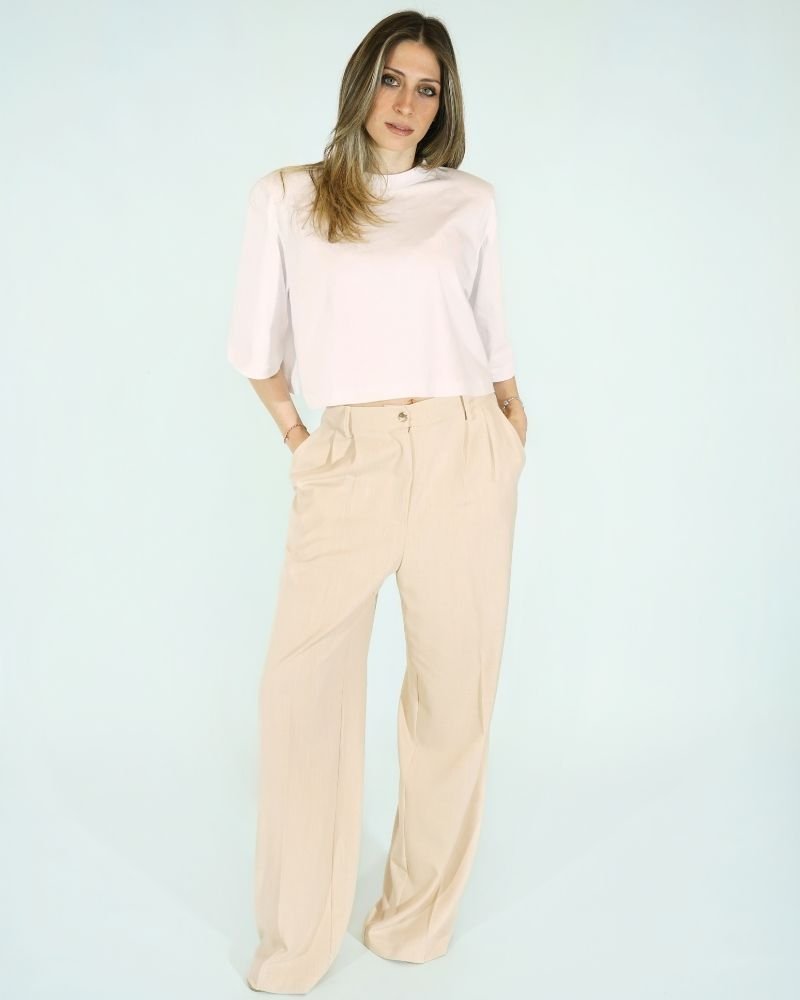 Το διαχρονικό μπεζ χρώμα του παντελονιού το καθιστά εύκολο να συνδυαστεί με διάφορα τοπ και αξεσουάρ,