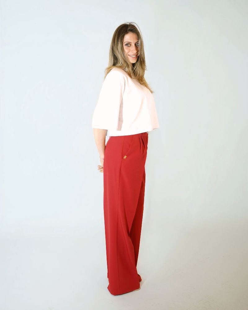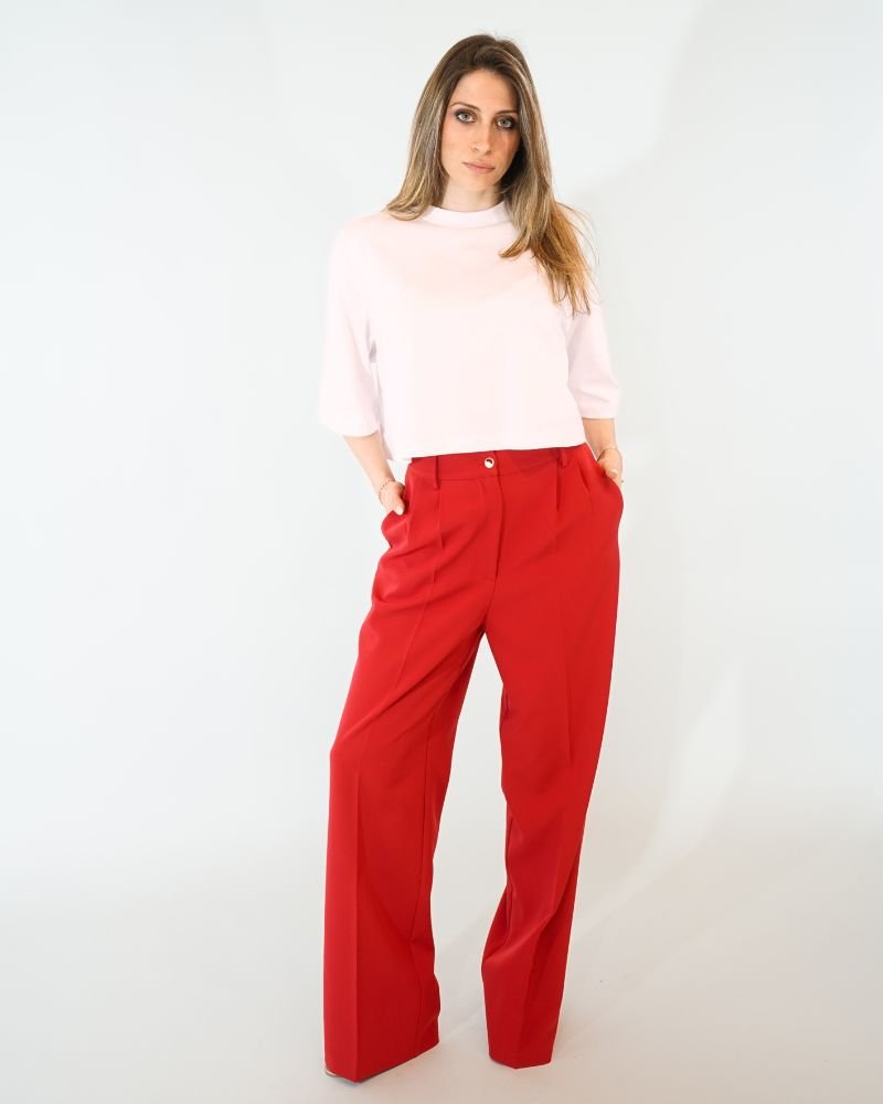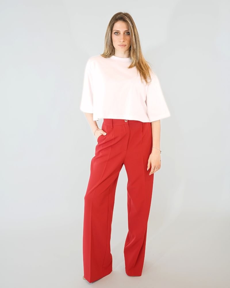 Το έντονο κόκκινο χρώμα του παντελονιού το καθιστά ένα εντυπωσιακό κομμάτι,